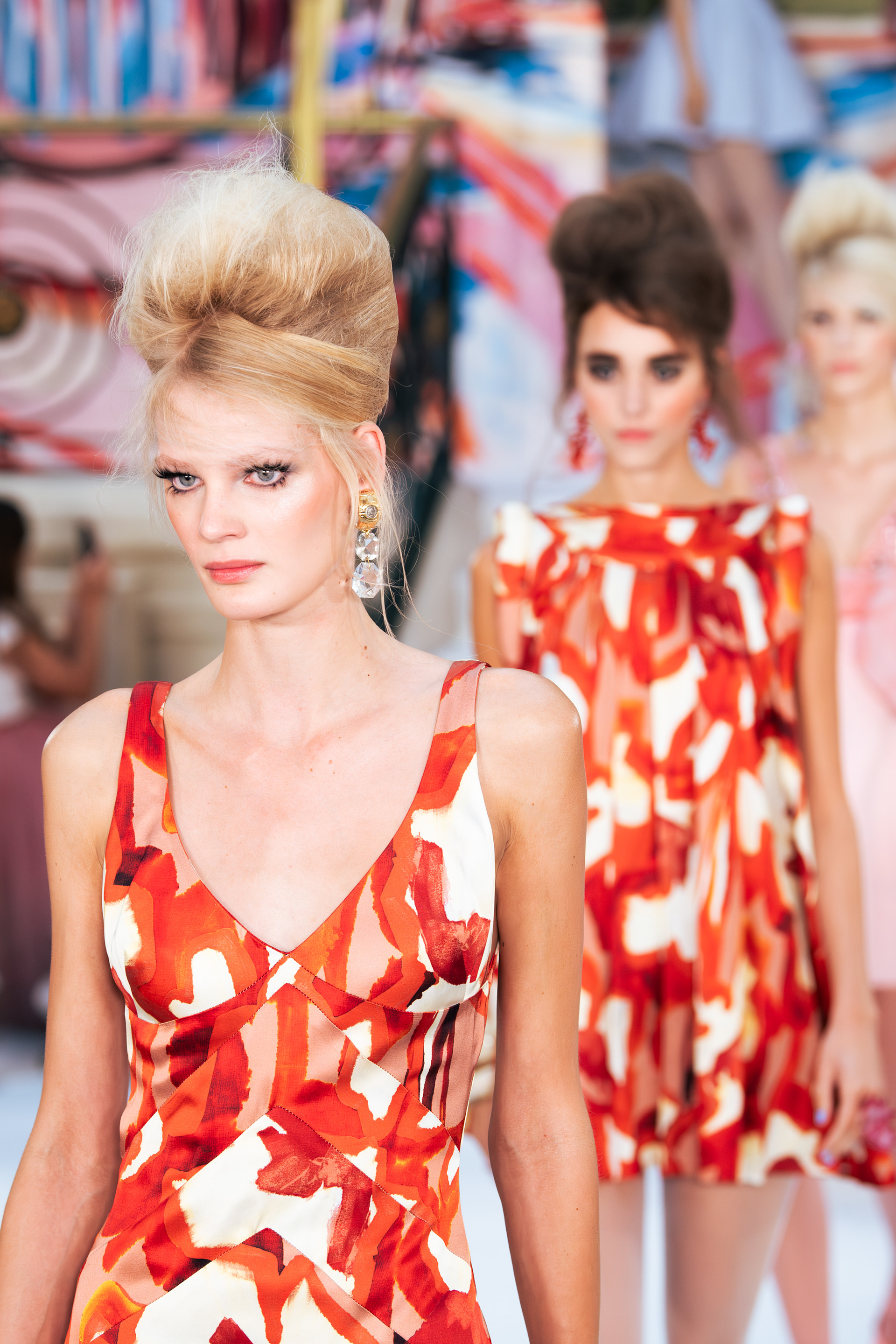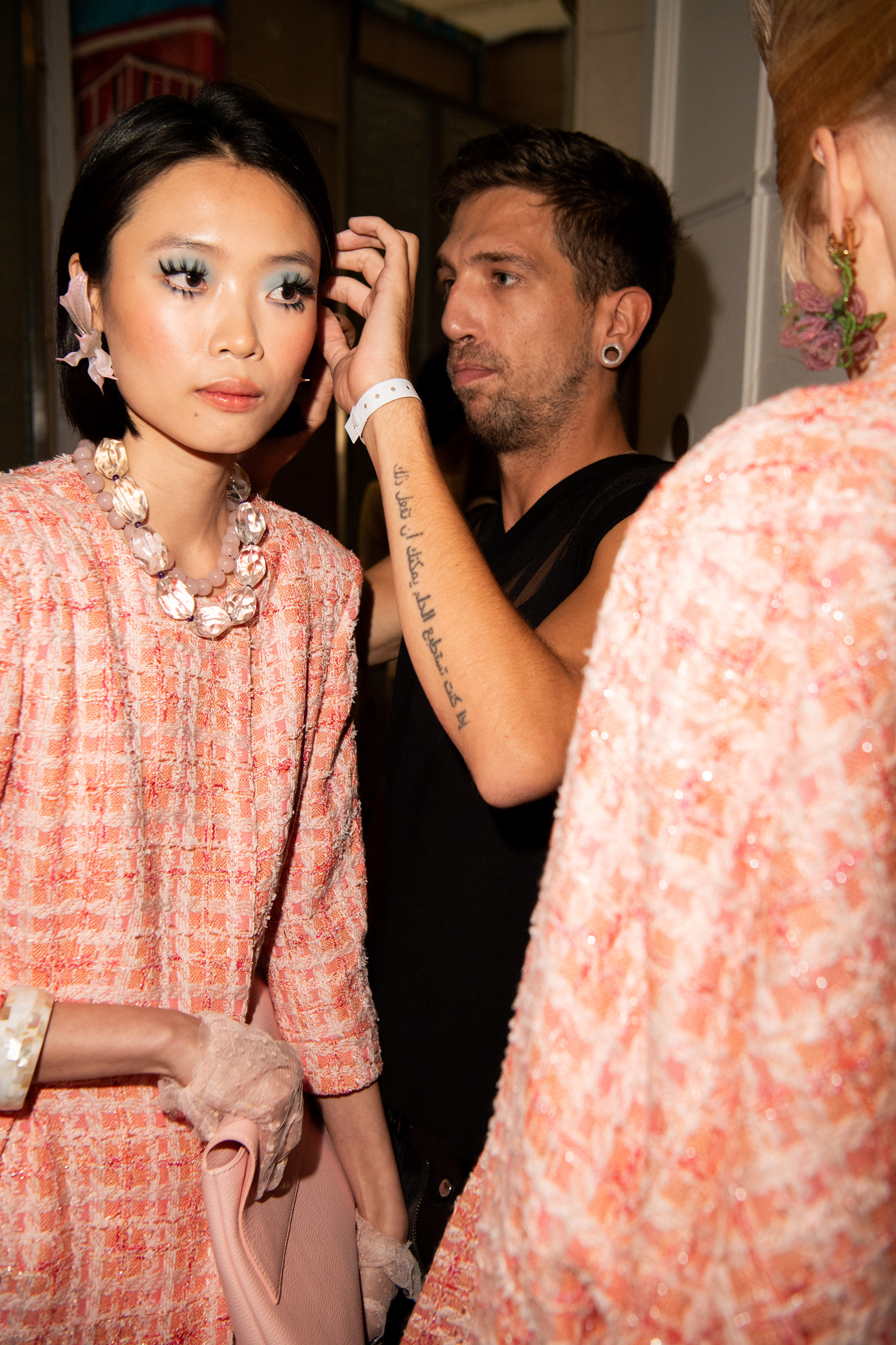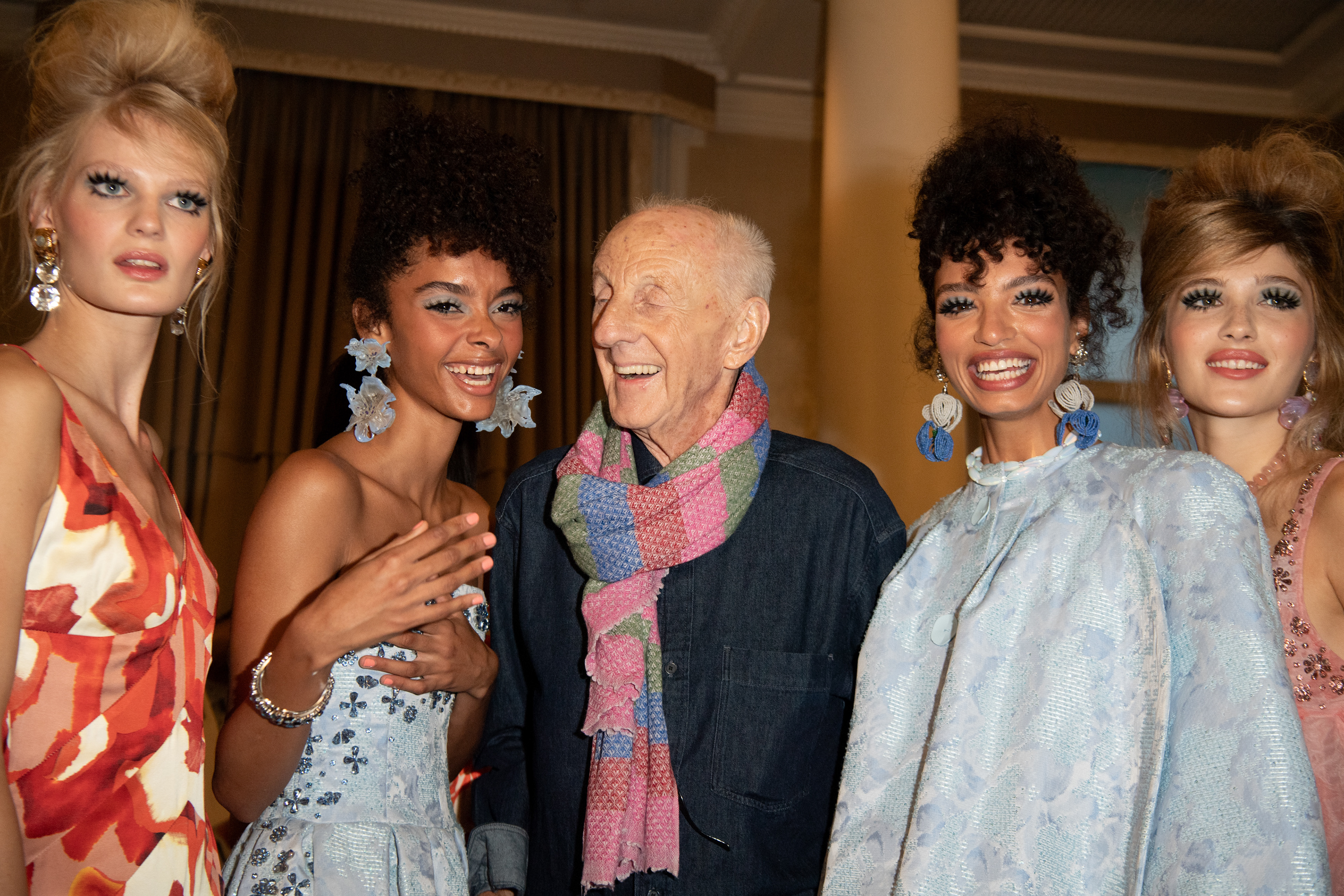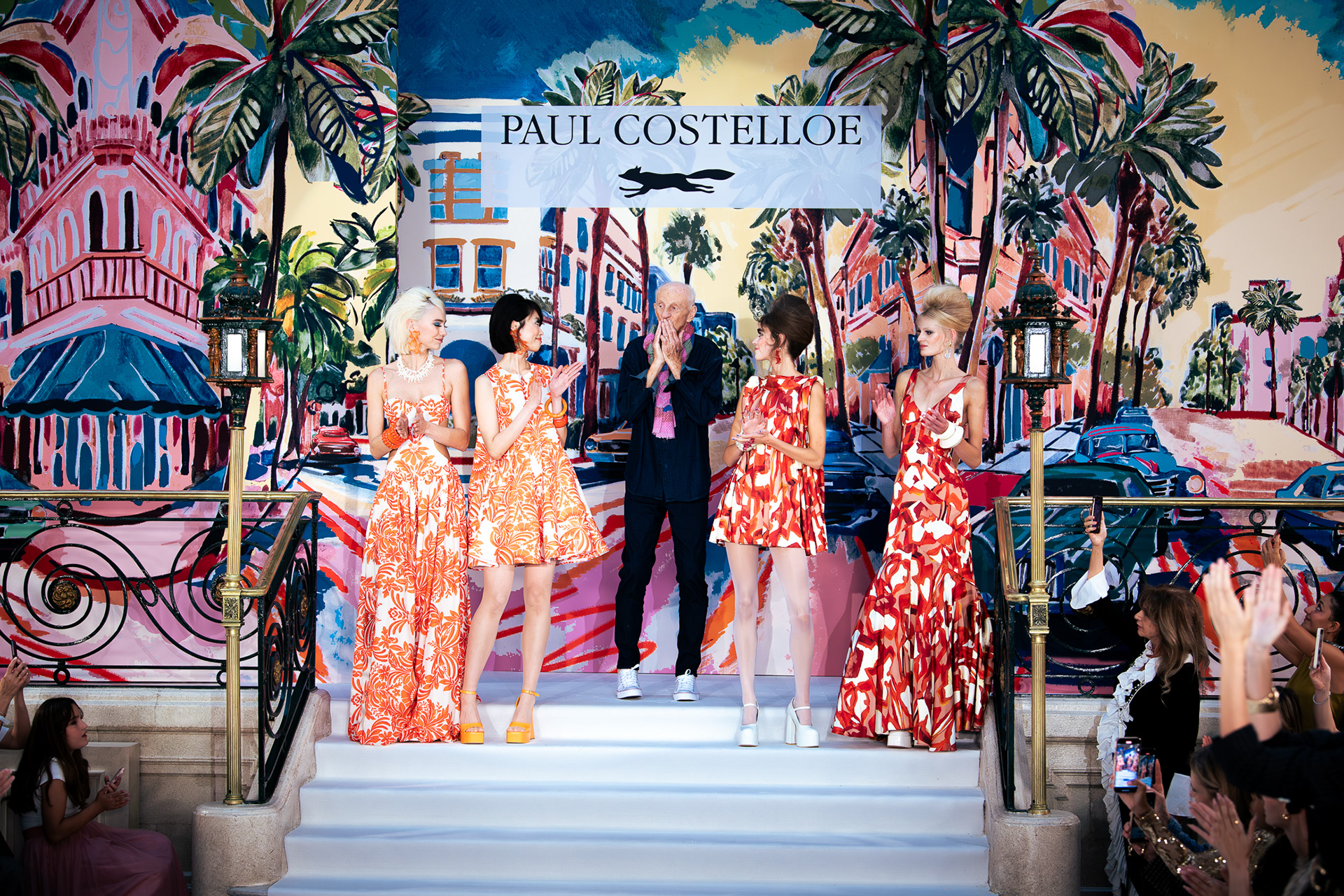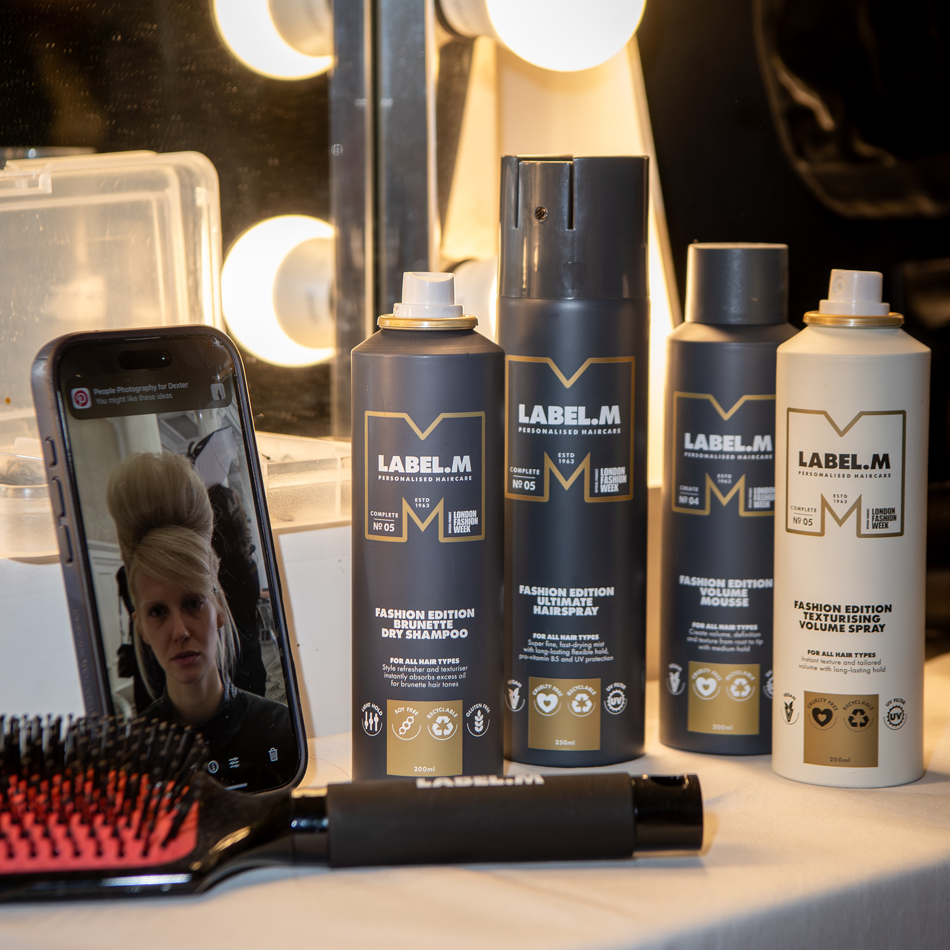Paul Costelloe (C) William Costelloe (L) Jessica Costelloe (R) with Cos Sakkas from Toni&Guy, final touches to the hair backstage.